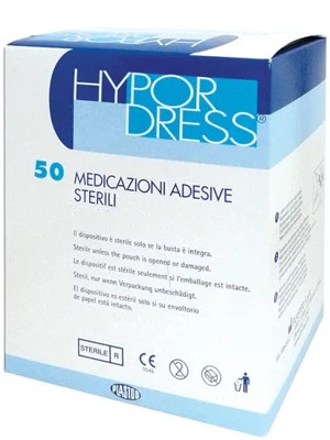 Sterile hypoallergenic adhesive dressing with central non wound-sticking absorbant pad. Sterile impermeable protection of surgical wounds, superficial wounds, cuts and abrasions.