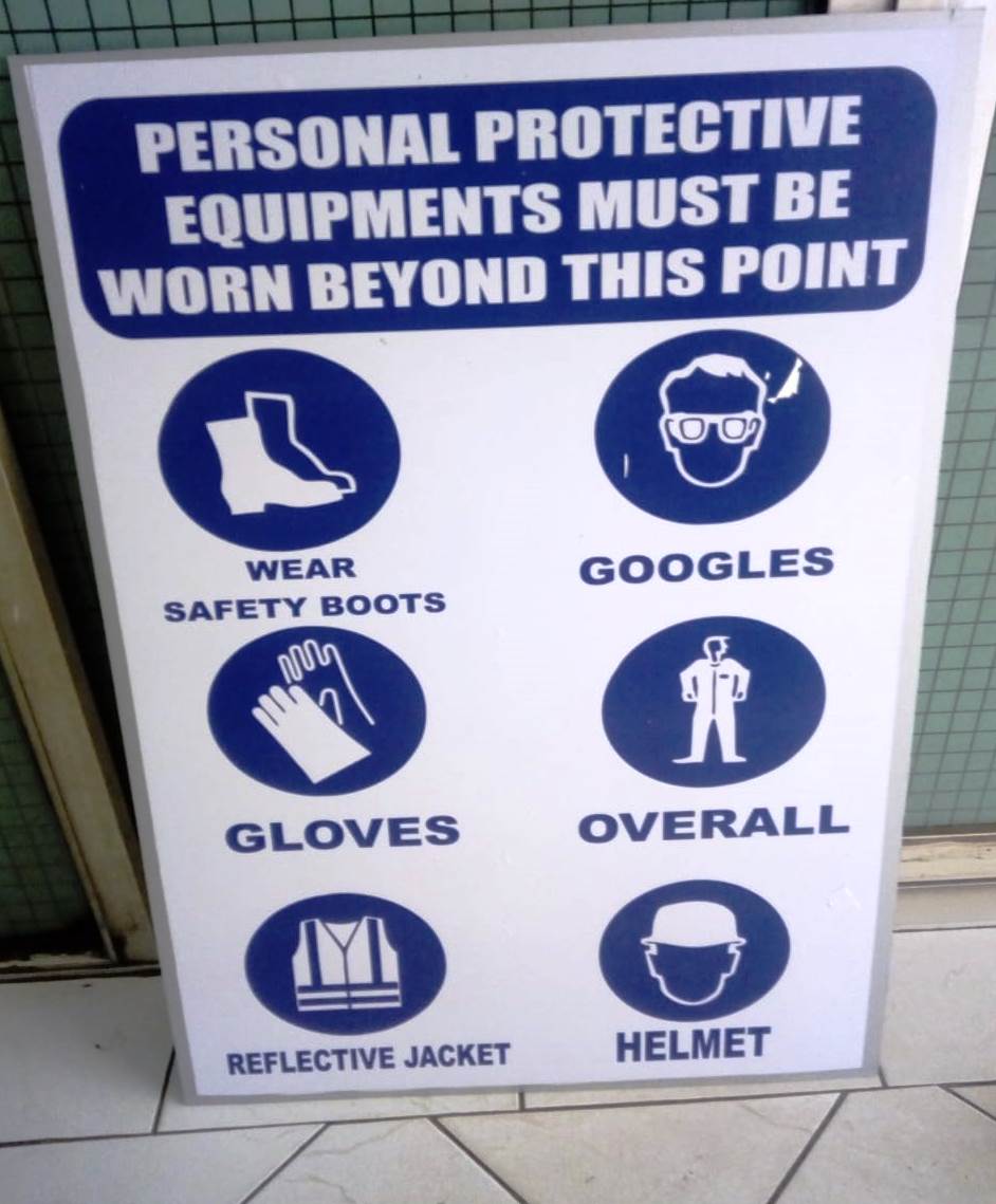 PPE SIGNAGE – A3 size All weather Safety signage made of Aluco Board or Forex Board material and Vinyl branding Wall mountable using screws or still nails. Forex Board can use double sided sticker. 400mm by 300mm