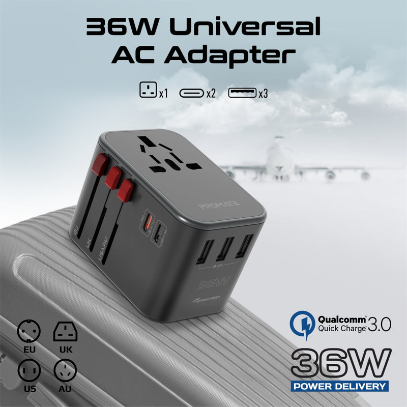 Transform your travel experience with the PowerGear-Pro by Promate, a sleek 7-in-1 charging travel kit designed to keep you powered and organized on the go. This compact kit includes the powerful Bolt-20PD 20000mAh Power Bank for rapid charging, the versatile TripMate-36W AC Adapter for global compatibility, and the speedy TransDrive-65W Mini Car Charger. Secure your device with the ClipMount magnetic phone holder, while efficient charging is handled by the XCord-Ci USB-C to Lightning Cable and the XCord-CC USB-C to USB-C Cable, in addition to the pusher case PERK, housing powerful 60W charge and sync USB-C cable, alongside versatile adapters, TF, Micro and Nano SIM card slots. All these essentials are neatly packed in the stylish, durable case, making your journey effortless and connected.