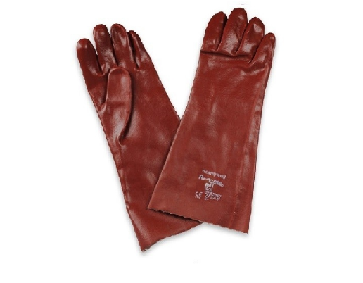 Red PVC chemical-resistant gloves, 1.4 mm thick, 400 mm long, with a smooth finish and cotton liner for comfort