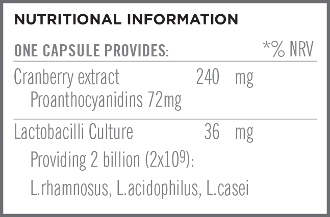 - Combines cranberry extract and lactobacilli probiotic bacteria, L.rhamnosus, L.acidophilus and L.casei