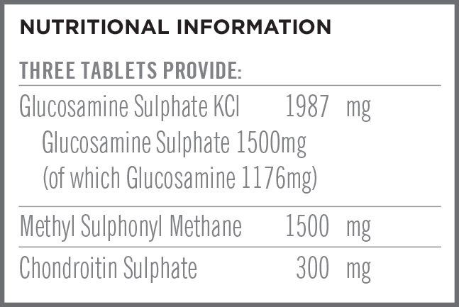 Glucosamine provides the structural matrix for cartilage whilst chondroitin sulphate provides much of its resistance to compression acting as a lubricant or as a shock absorber. MSM is an organic sulphur compound believed to have anti-inflammatory properties.