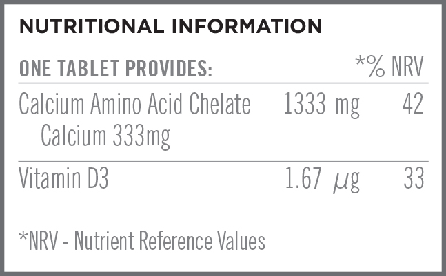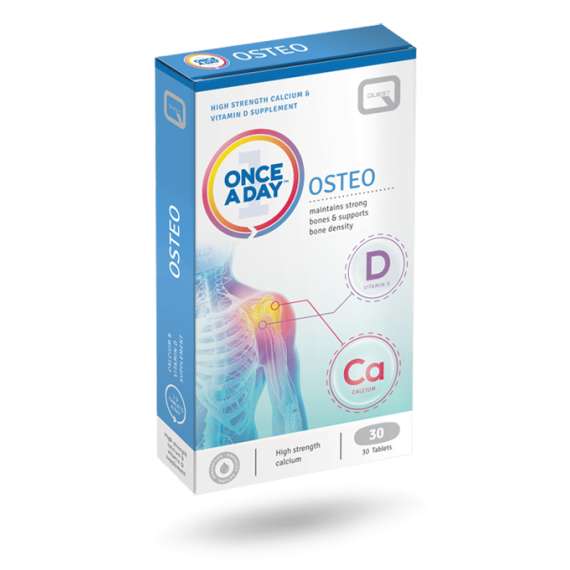 Quest Once a Day Osteo provides calcium and vitamin D which are needed for and contribute to the maintenance of normal bone, teeth and muscle function. As well as being a major structural component of bone, calcium also supports energy metabolism and the actions of digestive enzymes. Vitamin D, included as a synergistic nutrient, helps to maintain normal blood calcium levels and also helps to support immune function. The calcium in this product is chelated with amino acids for optimum absorption and utilisation.