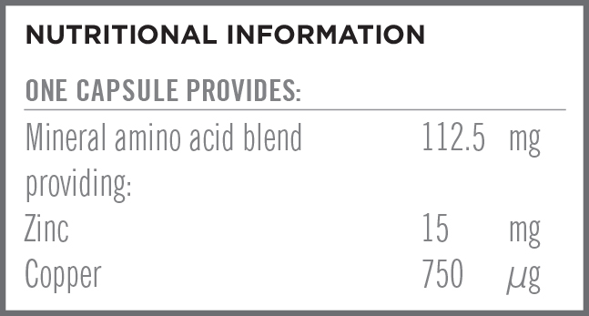 • Amino acid cheated zinc for enhanced absorption, balanced with copper.
