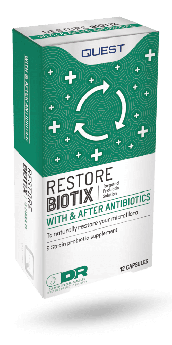 Quest RestoreBiotix is a multi-strain 6 day course of lactobacillus probiotics designed to restore natural microflora levels within the gut after a course of antibiotics. Antibiotics are indiscriminate and reduce the number of beneficial bacteria as well as pathogenic bacteria. Probiotics need to be re-established within the body to prevent adverse effects and chronic diseases such as food allergies and autoimmune conditions. RestoreBiotix contains 6 research-based strains of lactobacilli in a high potency, 10 billion bacteria count formulation to re-regulate the immune system and recolonise healthy gut microflora.