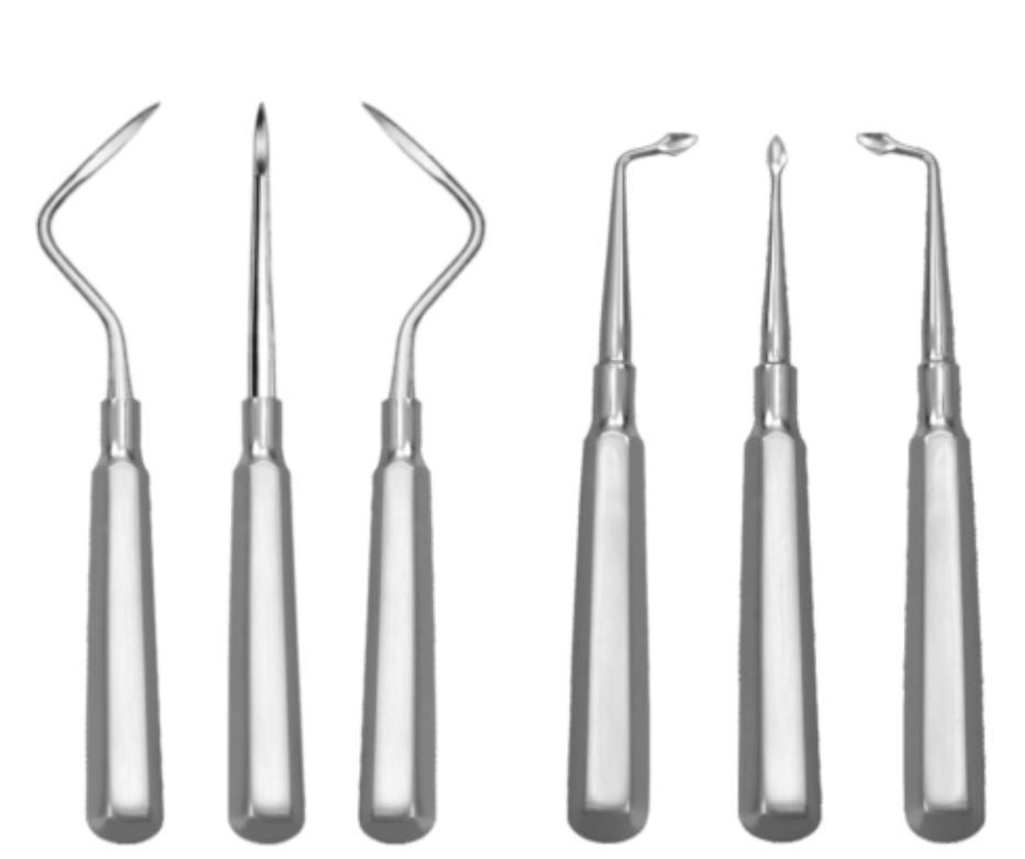 A dental root elevator is a surgical instrument used in small oral surgery to remove a tooth by loosening it from its socket. It carefully severs the tooth so it can come out easily.