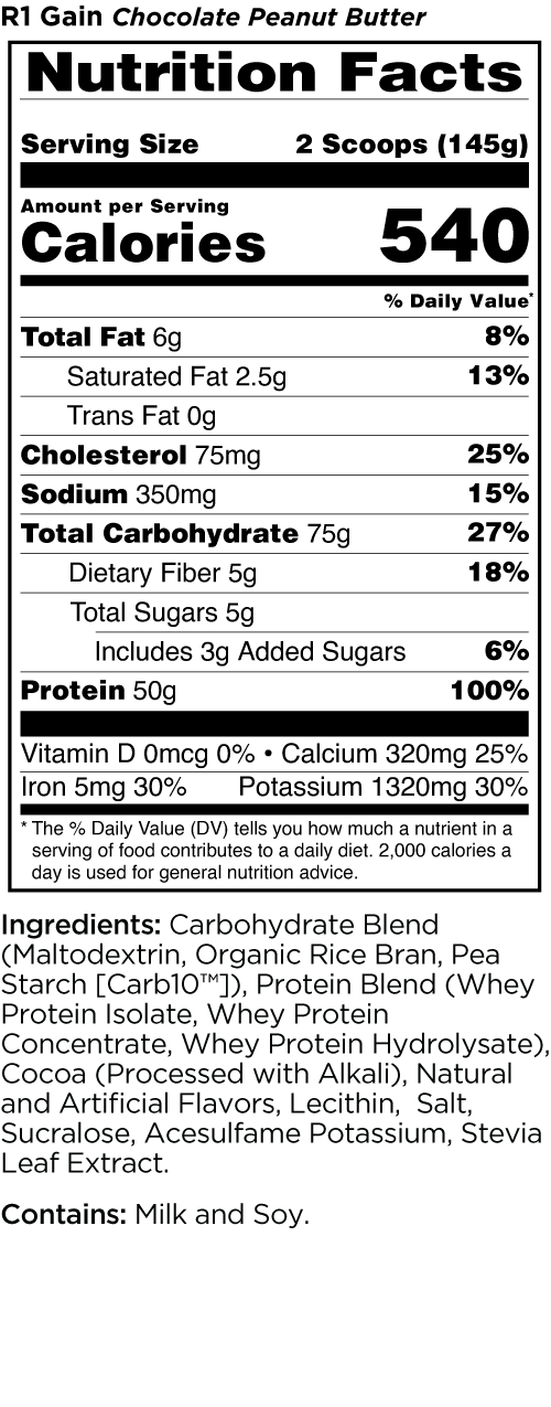 R1 Gain™ is packed with high-quality calories and all-whey protein, primarily from whey isolate sources. Plus, the simple and complex carbs help refuel glycogen stores after workouts.^