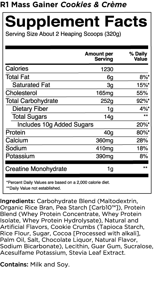 In addition to a 6:1 carb-to-protein ratio, this calorie-packed formula includes creatine, MCTs, and glutamine to help you achieve your most SIZEable aspirations.^