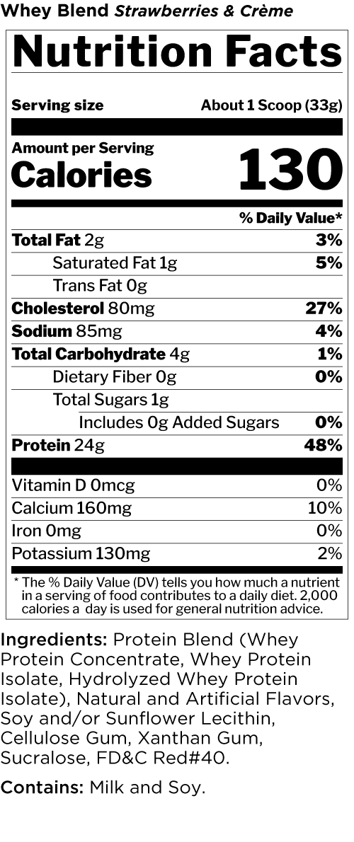 100% whey protein from whey concentrates, isolates, and hydrolysates perfectly blended for potency, taste, and value.