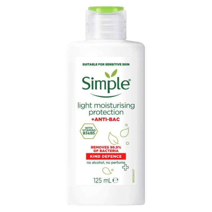 Simple Kind Defence +ANTI-BAC Light Moisturiser protects your skin from dryness and impurities, leaving your skin feeling moisturised and protected against bacteria