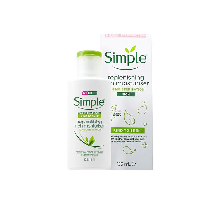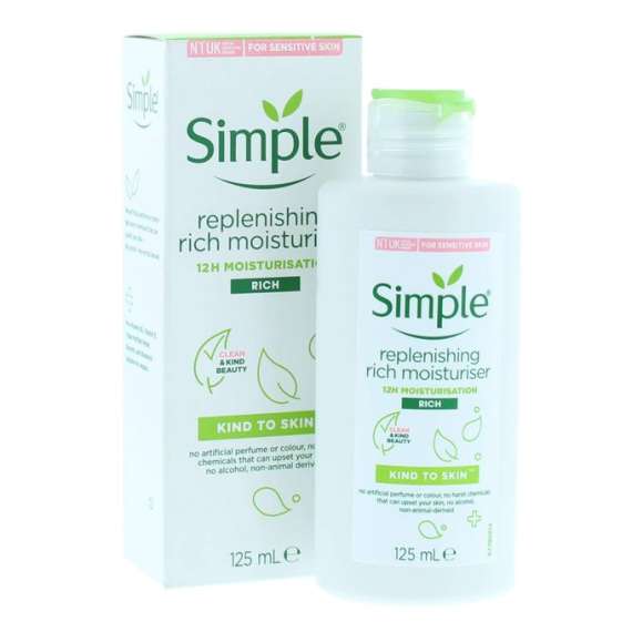 Simple Replenishing Rich Facial Moisturizer instantly doubles your skin's hydration. It works for up to 24 hours, leaving your skin feeling silky and nourished all day. Carefully blended with skin-loving ingredients, its formula is enriched with Pro-Vitamin B5 and Bisabol, to replenish, soothe, and hydrate your skin without the greasy feeling. Our facial moisturizer contains no color or dye, no artificial perfumes, or harsh chemicals that can lead to skin irritation or clogged pores, making it perfect even for sensitive skin. Dermatologist tested and approved. Ophtalmologist tested. Hypoallergenic, non-comedogenic.Simple Protecting Moisturizer is light enough for everyday use. Simple moisturizer nourishes your skin while fighting off sun damage.Simple is a complete range of facial skincare products perfect even for sensitive skin. The Simple brand knows that what is left out is as important as what is put in when it comes to gentle, yet effective skincare. The complete Simple range has 18 products, including cleansers, moisturizers, eye care, and wipes. All Simple products have no dyes, artificial perfumes or harsh irritants that can upset skin and contain skin-loving ingredients and added vitamins for natural, healthy-looking skin. Simple products are hypoallergenic,