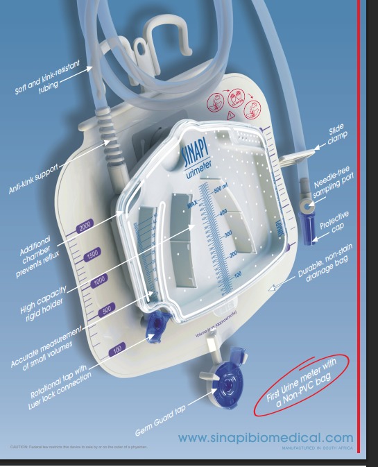 The non-invasive SINAPI Urine Meter (SUM) is intended for use, in conjunction with an inserted urine catheter, in any patient requiring strict monitoring of urine output, e.g. in post-operative and critically ill patients. It is a sterile, single use medical device intended to drain and collect fluid from the bladder. The Sinapi urine meter is manufactured from polymers with hydrophobic properties. In the rigid container, collected fluid is measured and recorded hourly (device volumes are approximate). Thereafter this container is emptied into the larger collection bag and fluid from the next hour is collected.