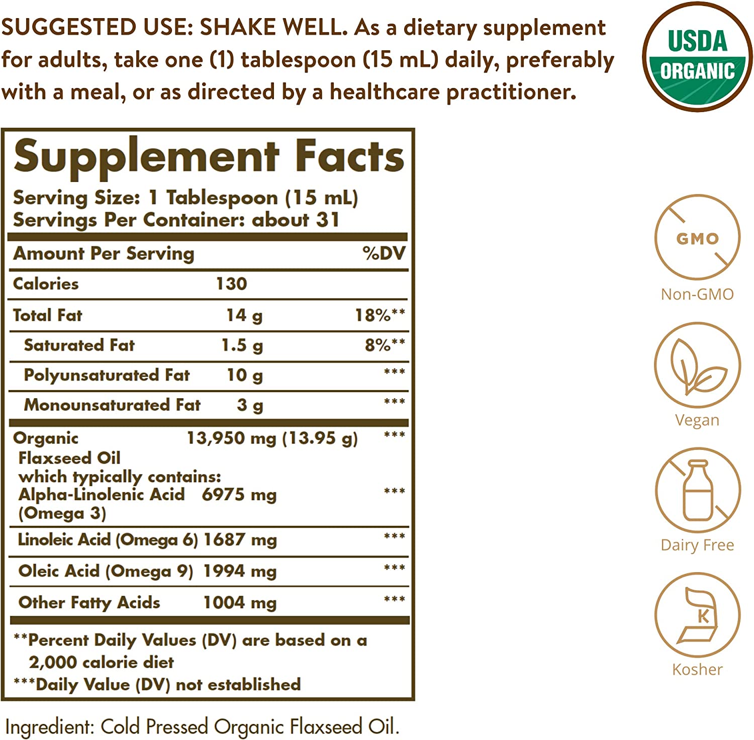 - Solgar Organic Flaxseed Oil provides one of the most concentrated vegan plant sources of Omega 3 Fatty Acids found in nature.