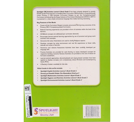 Spotlight CRE Activities Learner's Book Grade 3 has been uniquely designed to greatly benefit Grade Three learners in handling New Curriculum CRE Activities. It comprehensively covers Primary 3 CRE Activities Curriculum Designs as per the Competency-based Curriculum introduced by the Kenya Institute of Curriculum Development (KICD) in 2017. It is presented in a clear, simple, and precise language that makes learning interesting.