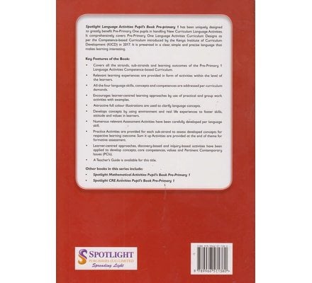 Spotlight Language Activities Pupils !look Presprimery 1 has been uniquely designed Ii greatly benefit Pre-Primary One pupils In handling New Curriculum Language Activities. It comprehensively covers Pre-Primary One Language Activities Curriculum Designs as per the Competence-based Curriculum introduced by the Kenya Institute of Curriculum Development (KILO) in 2017. It present. Ina dear, simple and precise language Mat makes learning interesting.