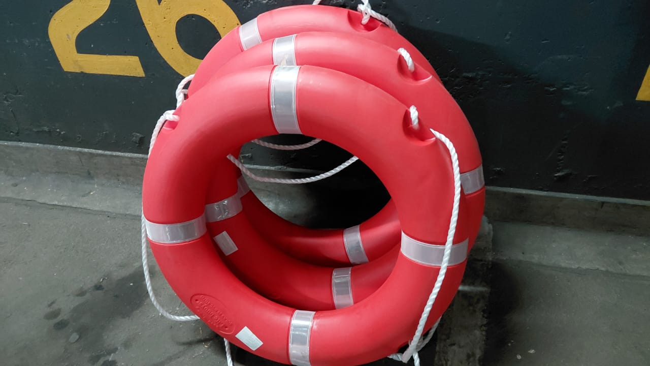 Life/rescue ring, orange with reflective grey strips and white rope, internal diameter 46 cm external diameter 72cm, 4.3kg, international standard as imo a.689(17)