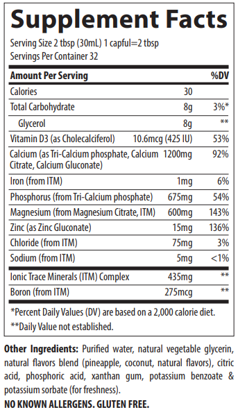 Liquid Cal/Mag/Zinc is a complementary blend of premium forms of calcium, magnesium, and zinc that has been supercharged with Ionic Trace Minerals to help support the assimilation and absorption of these minerals in the body. We've also included vitamin D to create a formula that provides complete nutrition to maintain bone, muscle, and connective tissue health. Adequate calcium and vitamin D as part of a healthful diet, along with physical activity, may reduce the risk of osteoporosis later in life. Also contains a concentrated complex of full spectrum ionic trace minerals.