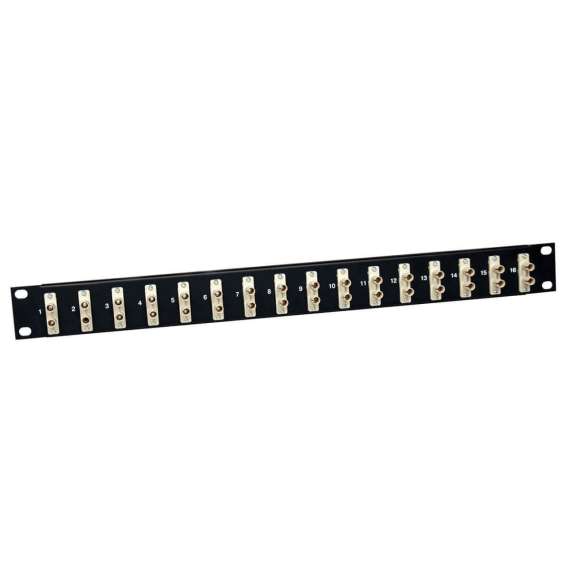 Tripp Lite's 16-Port 1U Rackmount ST/ST Fiber Optic Patch Panel provides efficient and easy management of fiber optic cables in the rack or cabinet. Pre-loaded, feed-thru duplex multimode connectors are mounted on a 16-gauge, cold rolled, black powder coated steel panel. Use with 62.5/125 or 50/125 Multimode, or, 8.3/125 Singlemode fiber patch cables. Panel measures 19" wide by 1.75" high.