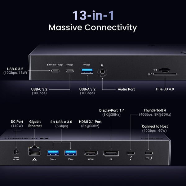 Highly Productive 13-in-1 Thunderbolt 4 Dock: The UGREEN Revodok Max 313 features Thunderbolt 4 (40 Gbps, 15 W), HDMI 2.1, DisplayPort 1.4, USB-C 3.2 (10 Gbps, 18 W), USB-A 3.2 (10 Gbps), 2*USB-A 3.0, microSD & SD 4.0 slots, Gigabit Ethernet, 3.5mm Aux, and a 140W power input.