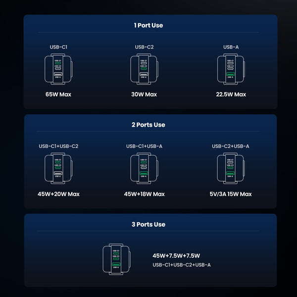 USB-C1 Output: 5.0V~ 3.0A / 9.0V~ 3.0A / 12.0V~ 3.0A / 15.0V~ 3.0A / 20.0V~ 2.25A, 65W Max