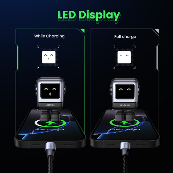 LED Display: Expressions change to show charging status.