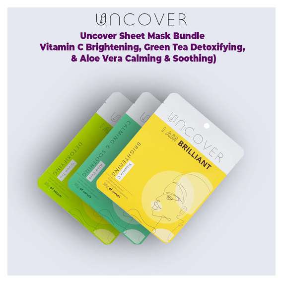 Uncover Vitamin C Brightening, Green Tea Detoxifying, and Aloe Vera Calming & Soothing Sheet Mask Bundle