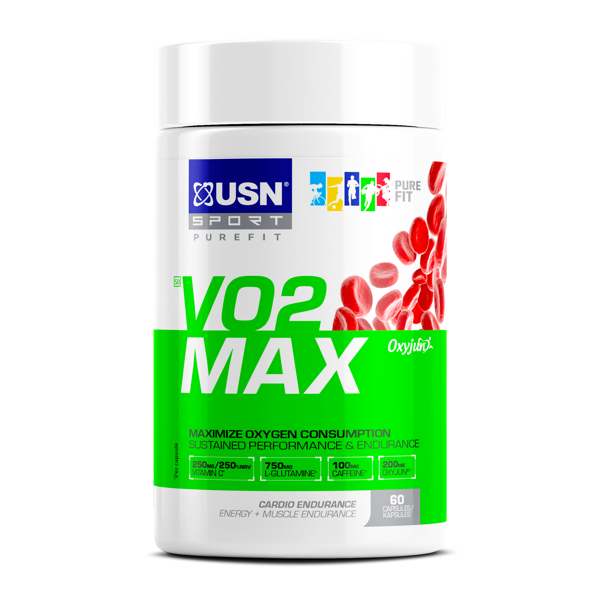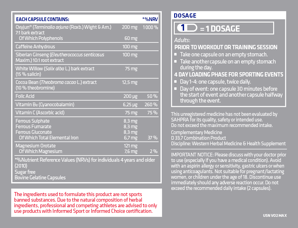 O2 Max is an advanced formulation of ingredients designed to enhance oxygen uptake and storage, boost muscle performance and delay muscle fatigue. VO2 Max contains patented ingredients such as Oxyjun™, a stimulant-free natural compound which has been found to increase the VO2 Max, accelerating performance and recovery.