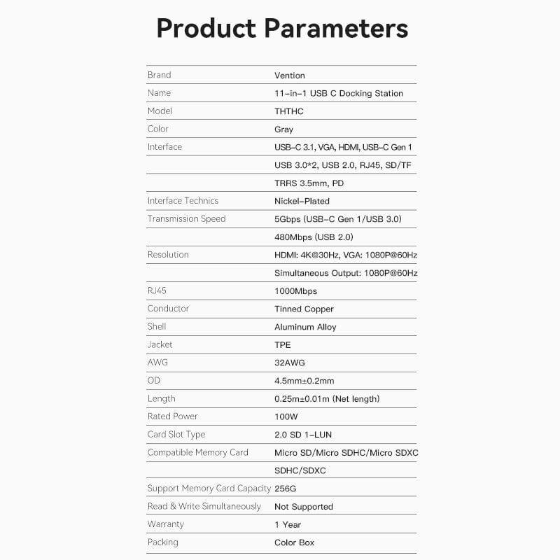 Vention USB-C MULTI-FUNCTIONAL 11 in 1 DOCKING STATION Type C to Multi-function USB-C to HDMI/VGA/USB-C Gen 1/USB 3.0x2/USB 2.0/RJ45/SD/TF/TRRS 3.5mm/PD Docking Station 0.25m Gray Metal Type Docking station