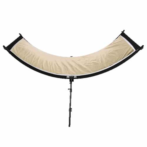 Its 74º arc shape coincides with the natural curvature of the human eye, avoiding its reflection, allowing the light to be naturally enhanced. The white finish reflects light while maintaining a neutral tone of the shot, without modifying its colour temperature. Produces a very soft effect by not bouncing as much light. The silver side enhances the brightness and contrast of the light, with a colder colour temperature, being harder than the white bounce. The gold surface gives the bounced light a warmer tone with the hardness characteristics of the silver side.