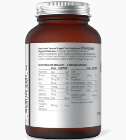 Vitamin C and Bioflavonoids incorporated in Citrus pulp, Mineral enhanced Yeast providing; Vitamin D3, Niacin, Selenium and GTF** Chromium; Lactobacillus bulgaricus providing; Zinc and Copper, Beta-Carotene incorporated in Carrot concentrate, N-Acetyl Cysteine, Elderberry extract, Maitake Mushroom powder (Mycellised) and Oyster Mushroom powder (Mycellised), Heat treated brown rice powder, Vegetable cellulose (capsule shell).