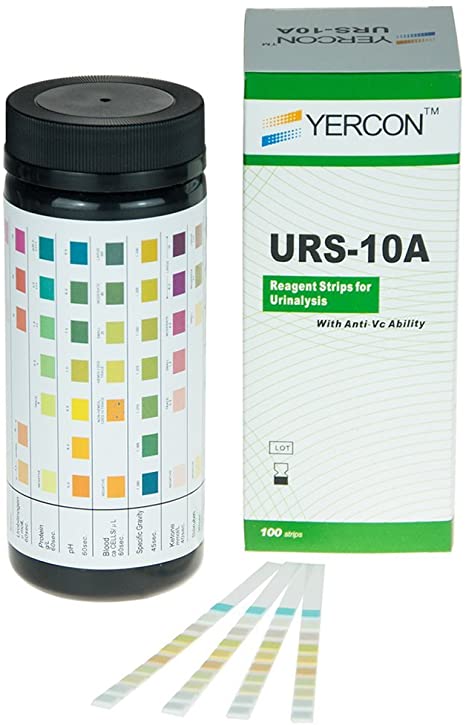 o 100 x strips that each test for 10 parameters: tests for Glucose, Protein, pH, Blood, Nitrile, Specific Gravity, Leucocytes, Urobiligen, Ketones, Billirubin.