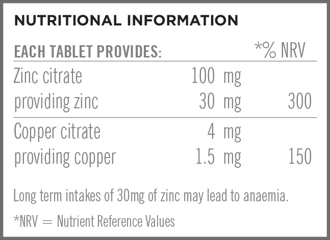 Zinc is an essential trace mineral and is needed for hundreds of enzymatic processes within the body. Zinc works in balance with copper which is why it to added to the formulation. Zinc and copper are antioxidants, support immunity and may reduce histamine related allergic responses. Zinc is required for the normal function of the skin, hair and nails and helps with acne and hormone related skin conditions. Zinc contributes towards protein synthesis and is taken by athletes to encourage the growth of muscle mass. It is also needed for fertility, reproduction, normal testosterone concentrations and increases libido. Zinc is an important mineral for normal cognition and brain function.